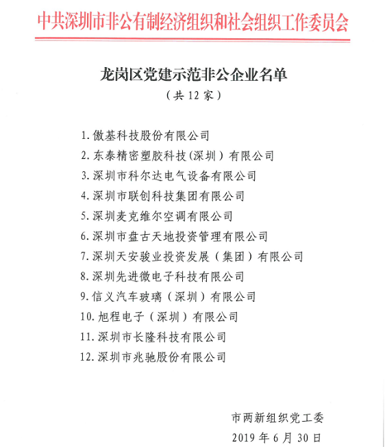 从深圳市两新组织党工委获悉,我司有幸成功入选深圳市非公企业党建“百企示范,整体提升”项目企业。