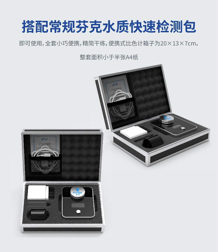 配合快检包,使用的手持式比色计,准确读取浓度数值,余氯、总氮、氨氮、磷酸盐、铜,一键准确检测